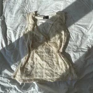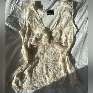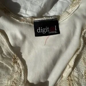 Vintage Digital Clothing babydoll top featuring delicate cream lace with soft gold floral detailing. Flowy empire waist silhouette with a romantic, feminine feel.