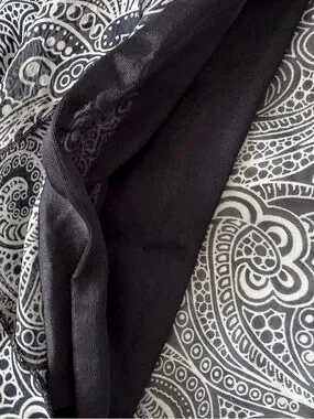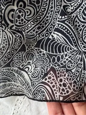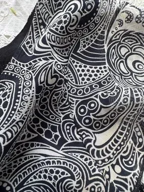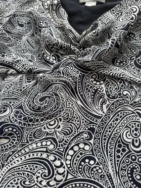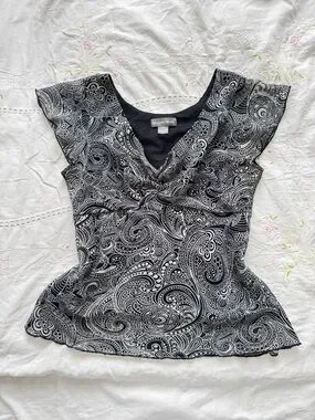 black and white paisley top with a flattering V-neck and cap sleeves. Soft, lightweight fabric drapes smoothly for all-day comfort. Elegant monochrome print pairs easily with jeans or tailored skirts.