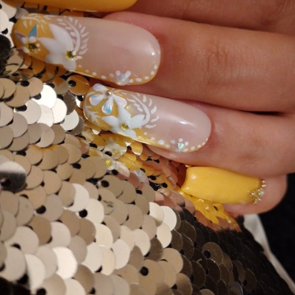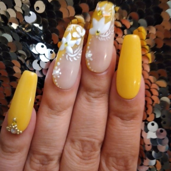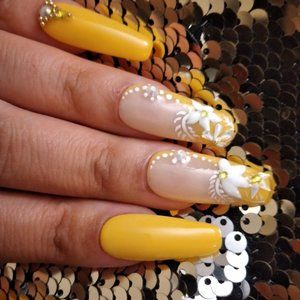 These sweet spring/summer yellow and white flower press on nail can come in any length and shape and color