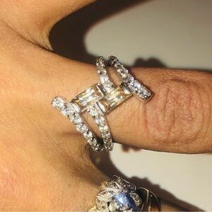 Sterling silver & cubic zirconia stone ring - 2 peach coloured rectangle center stones with small clear Cz stones on band. Bypass style ring.
