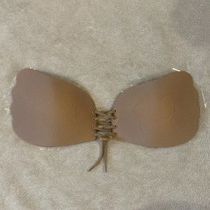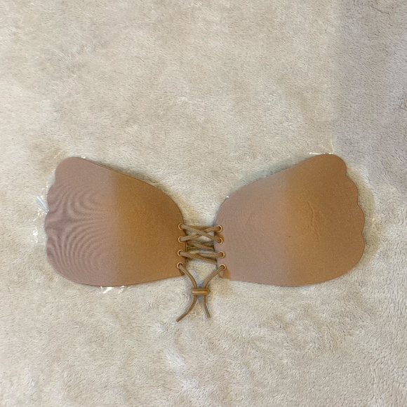 Light tan colour adhesive bra, never worn, protected with plastic layer. Very strong stick and has a lot of uses before adhesive starts to not stick around the edges as well. How to use: take off plastic, loosen ties, centre on breasts, tighten ties too desired look. I think it is a B cup but works for any A or C cup as well.