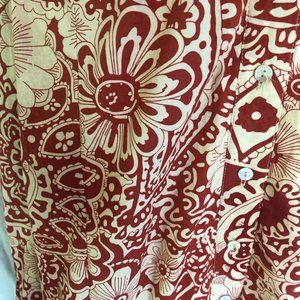 Beautiful cream and red print. Skirt buttons up the middle and top is tied. This is a size 3X but my dress form is a size 10 so I had to pin it to give the effect of what it will look like. You can also look up the product number in the photo and see it online.