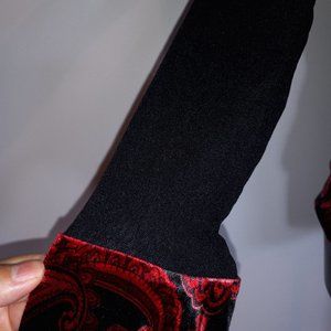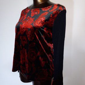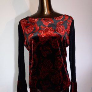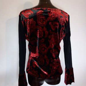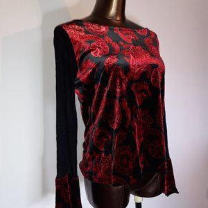 This stretchy velvet floral print top with sheer sleeves and matching velvety bell cuffs is from the 1990s. Boat neck.