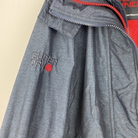 Triple zip hooded Technical Windcheater jacket. A member of the iconic Wind family, this jacket features the classic double layer collar, two front zipped pockets, ribbed cuffs and a bungee cord hem. Inside, the Technical Windcheater jacket has a mesh lining and an inner popper fastened pocket. This jacket is finished with an embroidered Superdry logo on one sleeve and a back shoulder.