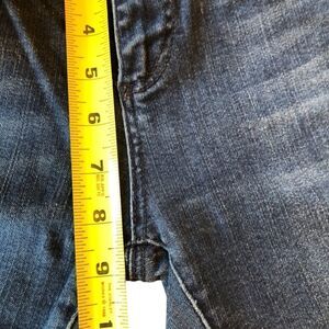 In excellent pre-owned condition, dark blue denim, size 26, some stretch. See measurements.
