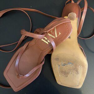 The perfect warm tone tan kitten heels from Zara. They have two easy adjustable strings to wrap up the leg. They're about a size 4.5-5 in American sizing.