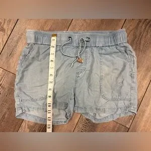 Light blue chambray shorts with elastic waistband and drawstring. Front patch pockets and relaxed fit. Casual and breathable fabric. Subtle tentree logo charm on drawstring.