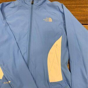 THE NORTH FACE woman’s flight series shell. Periwinkle blue/white. Size Small. Full zip, zippered pockets. Adjustable drawstring. Darted back for flattering fit. Reflective accents. Velcro adjust wrists.
