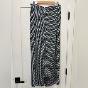 A full, pull on pant with elasticated gathering at the back waist, a thin drawcord, and on-seam pockets. Wide- leg with a draped silhouette. Made with lightweight, non stretch crepe fabric in geometric print.