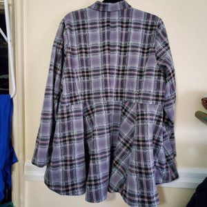 Light purple, pink, and black plaid jacket with flowy peplum fit-and-flare design. High-lo hemline. Decent amount of stretch for a jacket as the fabric is a spandex blend. I really like the design of this but I just never had the occasion to wear it. Torrid size 2X women's 18/20.