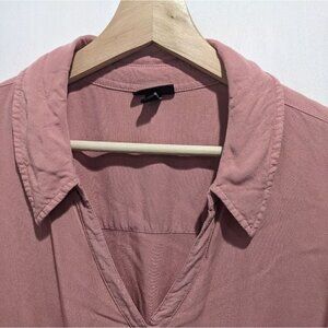 A twill shirt takes a new direction with a peplum hem, roll-tab sleeves, and a split neck.