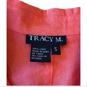 Gorgeous Tracy M. 100% Linen Long Sleeve Blouse. Cuffs can be folded up and their is an extra button inside blouse. Pleats across the front and full button up. Size Small Like New EUC. See measurements. Shoulder to shoulder 16 inches, armpit to pit 19 inches, length 2 feet.