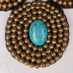 Chunky circular hand braided necklace with oval turquoise coloured center beads surrounded by round metal gold toned beads.