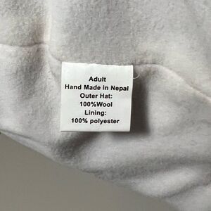 100% wool with polyester lining. So adorable and well made. Embroidered flowers a d a bird at the front.