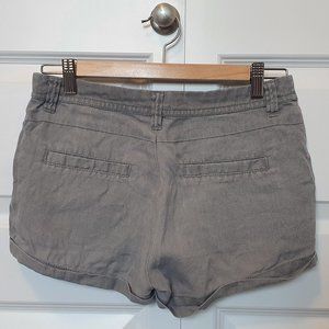 twik (Simon's) grey shorts. Sized at a 3, but they fit a bit bigger than that. Can be belted, as belt loops are available.