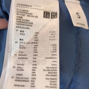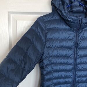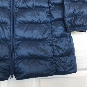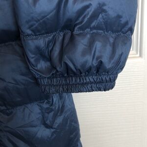 Blue lightweight down filled zip up coat. Actual color is a bit lighter than showing in pics. Hood with toggles to cinch if desired. Elastic cuffs on sleeves. Slip pockets at hips. Zips up from bottom for freedom of movement. Pit to pit 18”. Length shoulder to hem 30”.