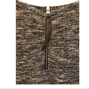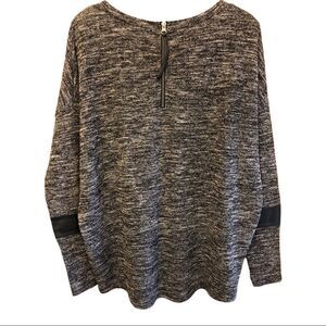 In great used condition, this black and great heather round neck pullover is comfy and large for a size small. Has leather (not sure vegan) bands on sleeves and pull up tassels on zip up at back. See measurements. More like a medium/large with drape shoulders.