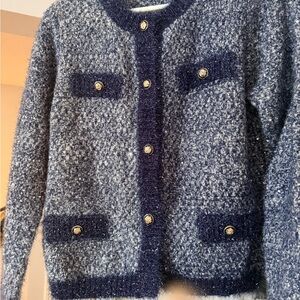 Stylish navy and gray textured cardigan with button details. Perfect for layering.