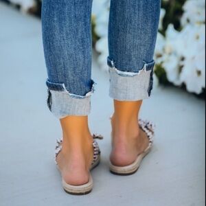 Super cute easy to wear and style Cheetah Print Slide Sandals with rubber sole, jute trim edge, and faux suede knotted detail! Perfect slide sandals to style for warmer weather!