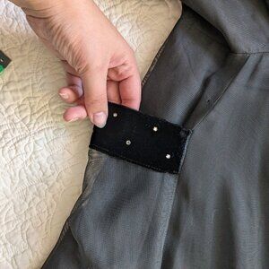 wears great, but has some flaws, such as rhinestones missing and naked velvet patches (as soon in photos). Has its original metal zipper