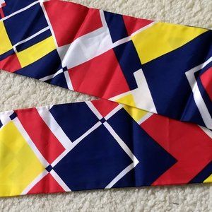 long skinny rectangular scarf in navy blue, yellow, red and white geometric angular print in groovy funky bold mod style.