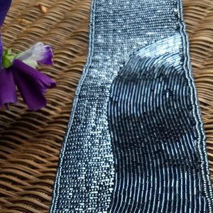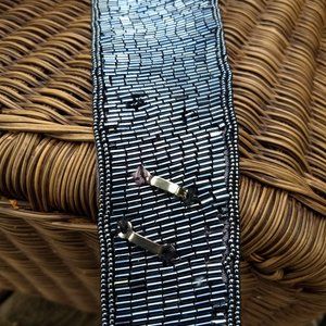 hematite seed beads in abstract wave pattern on matching cumberband/obi style belt and evening clutch bag