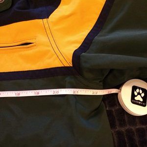 faint pen mark on yellow chest area, chest pocket area light discoloration from the zipper - see pics