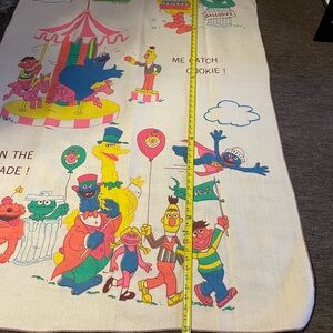 Vibrant tapestry featuring beloved Sesame Street characters. Perfect for fans and collectors. This blanket is new from the 80s. It's been in a storage bin. It's never been used very cute for a kids room. Measurements are in the pictures. 72 L x 44 w in size. Not sure about the material does not say on the blanket.
