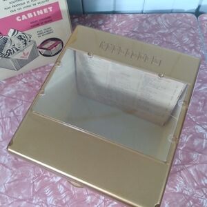 Wheat design on the front. Has hinged plastic lid. The lid is copper colored with a window to view the recipe card during food preparation.
