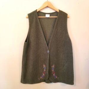 Vintage Vest, By Visible Ink. Green Fleece in good condition, with floral embroidery. Single button enclosure.