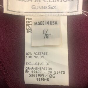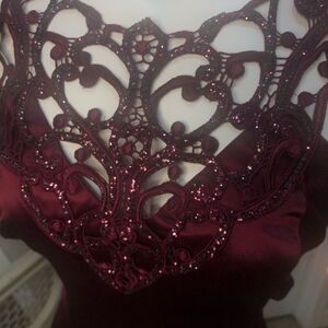 Beautiful burgundy satin like dress. With blingy vneck appliqué. Zip back. Fabric: Acetate & nylon. Perfect for that special occasion: prom, wedding, holiday party dress.