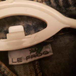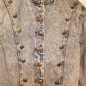 Talk about vintage! This old school jean jacket by European designer Le Frog is awash in 80's vibes. From the waiters cut (short & pointed at the front, waist length and notched detail at the back), bat-winged sleeves, military styled distressed gold buttons on front and epaulets....and even shoulder pads!!! 100 % cotton and sturdy as only 80's acid washed denim can be!! Made in Germany. Note: there is no bottom button- was that way when I bought it years ago.