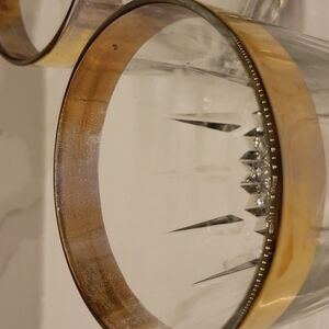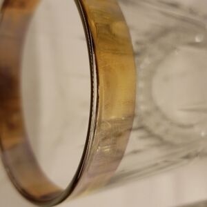 These lovely tumblers are in good vintage condition with some wear. Gold band has some scratches, discoloration/fading. Clear glass may have a few bubbles and small scratches. Two of the glasses in this set have small chips on gold rim. See photos.