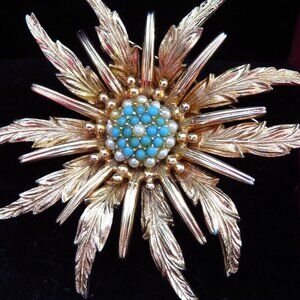vintage M BOUCHER set pin Brooch and earrings, domed turquoise, gold, RARE, star