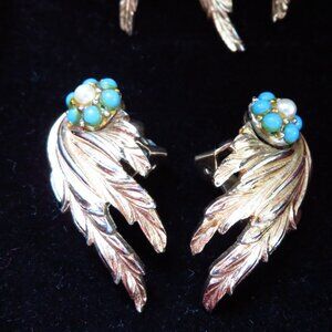 Discover the epitome of timeless elegance with this rare vintage Marcel Boucher set pin brooch and earrings from 1960. Adorned with domed turquoise stones and crafted in luxurious gold, these stunning pieces are punctuated with a star design that truly sets them apart. This collector's item seamlessly blends retro charm with striking sophistication. Perfect for adding a touch of vintage allure to any ensemble, this curated custom jewelry set exemplifies our commitment to offering the finest in vintage and unique accessories.