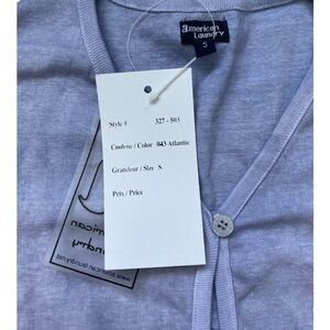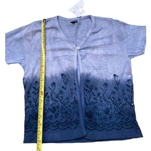Beautiful vintage dead stock piece new with tags! Cute single button style cardigan. Very early 2000’s or 90’s style. 100% cotton t-shirt material. Ombré bright pattern from pastel purple to periwinkle and navy blue with black flower detail along the bottom hem. Bust measures about 32”. Length from the shoulder seam is about 18” so a bit cropped