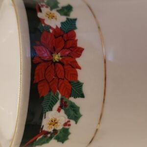 This lovely tea pot is in very good condition with minimal wear of a tiny white dot scratch on poinsetta, black dot, some of the gold worn off especially at spout. See photos.