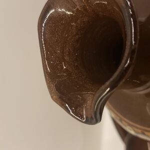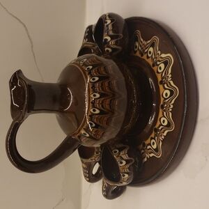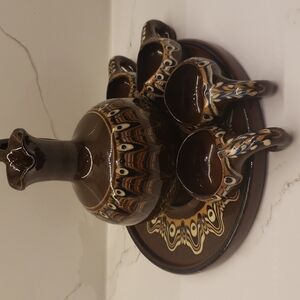 This lovely dark brown pottery set with blue/white/gold decorative trims will look beautify in any setting.