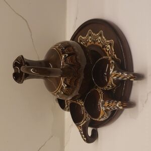 #833 Vintage Trojan Redware Pottery Decanter Set Ewer Pitcher five cups and plate tray 6"h x 8"diam