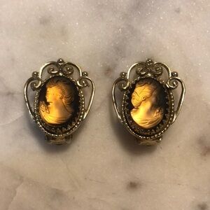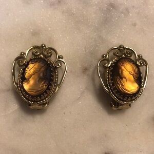 vintage Whiting Davis Clip Earrings Brown Gold Glowing Cameo Signed 1.1”