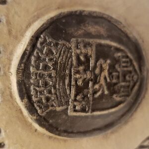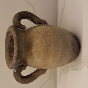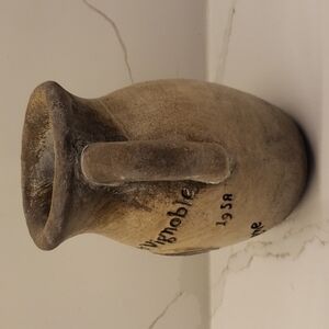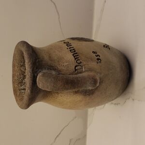 Vintage Wine Jug Domaine Des Vignobles 1958 Bourgogne Unglazed Ceramic Double Handle Vase Pitcher Wine Bar Decor Bohemian Modern Mid Century Measures 7" high x 7"" wide x 4" diam. Double handle vase with crest in centre. Very heavy urn.