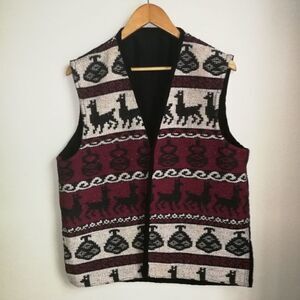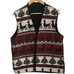 vintage Woven Southwestern Red Black & White Llamas Sleeveless Vest Size Large