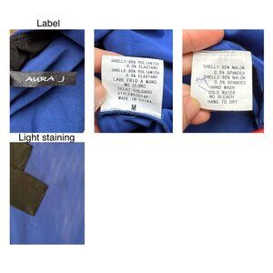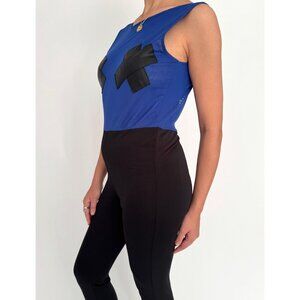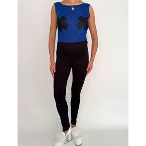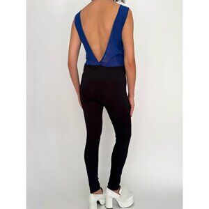 this is a statement one piece jumpsuit from the 2000s featuring a sci fi cyber club kid vibe – it’s super lightweight and would be comfortable to wear to a festival, rave, or out clubbing! the sleeveless pantsuit features a high and wide neckline, an open V cut back, a high waisted tapered leg, graphic X-shaped fabric patches on the bust, and is step-in style with no closure. the blue bodice has a mesh-like feel whereas the bottom is more smooth, and the garment is made of a slightly sheer nylon/spandex blend with a bit of stretch, and is unlined. although the silhouette is flattering and fitted, the garment doesn’t feel stuffy or tight, because the fabric is so lightweight.