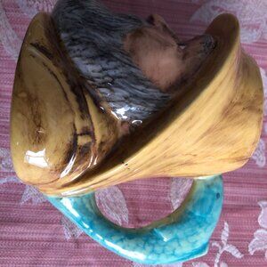 vintage ceramic mug man face head hat fish handle signed 4.5" tall