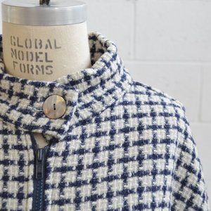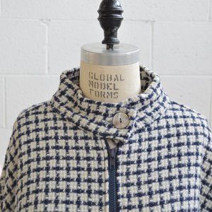 classic navy blue & light grey checkered wool cape coat with a purple soft interior!