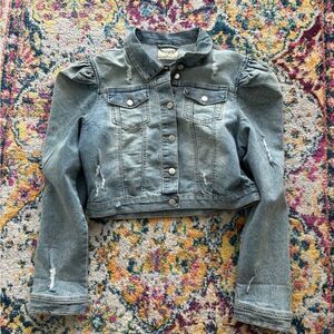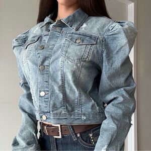 downtown girl Vintage light wash distressed coquette streetwear preppy puffy shoulders cropped jean jacket