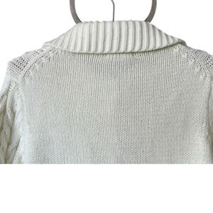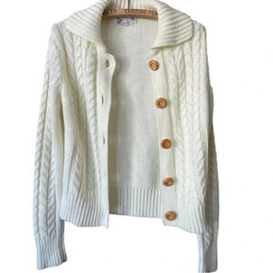 Made by Barbra Sue, this is a light weight acrylic version of the traditional "fisherman" sweater, made in classic ivory, off white using the cable knit design. It has a wide collar and the original brown wood buttons in the front.. The measurements, taken with the sweater lying flat, are approximately, shoulder to shoulder, 15 inches; armpit to armpit, 18 inches; sleeves, 26 inches (uncuffed); length, 22 inches; bottom edge, 14 inches (with stretchy ribbing). The sweater overall has quite a bit of stretch. In very good condition.
