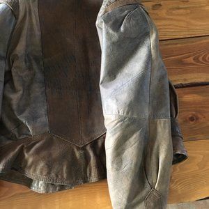 stamped leather, padded shoulders (can be removed with little sewing). Fits loose at the shoulders, comes in at the waist for a nice look.