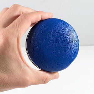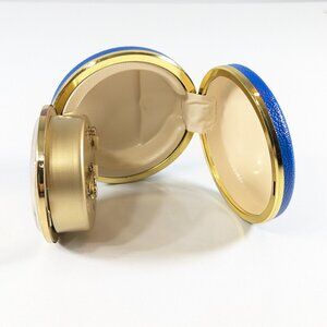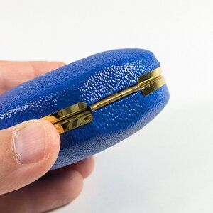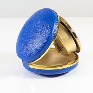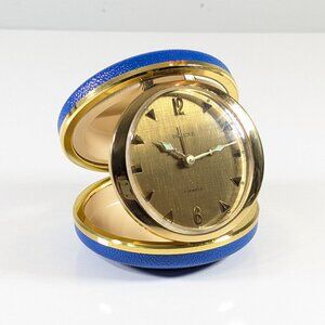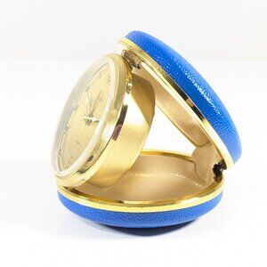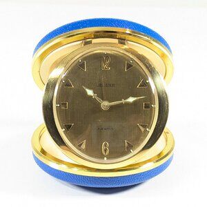 A retro travel clock in bright blue casing, made in Germany. The clock face is a slight oval, with a satin brushed gold background and geometric glossy gold shapes for the hours. The outside of the hour indicators have a small painted loom dot, which glows in the dark. The same is applied to the clock hands. The clock is marked for DELUXE 7 JEWELS, and "Germany" to the back.