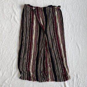 vintage V.I.Petites black, burgundy, olive, cream striped midi skirt with two-button waist. someone added a pin to keep it from opening too much and it creates an interesting fold style :)